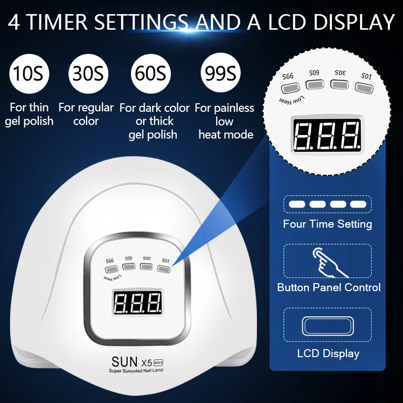R: Le temps de séchage dépend du réglage de minuterie que vous choisissez. Les options vont de 10 secondes à 99 secondes, vous permettant de choisir la durée de séchage qui convient le mieux à votre vernis gel.