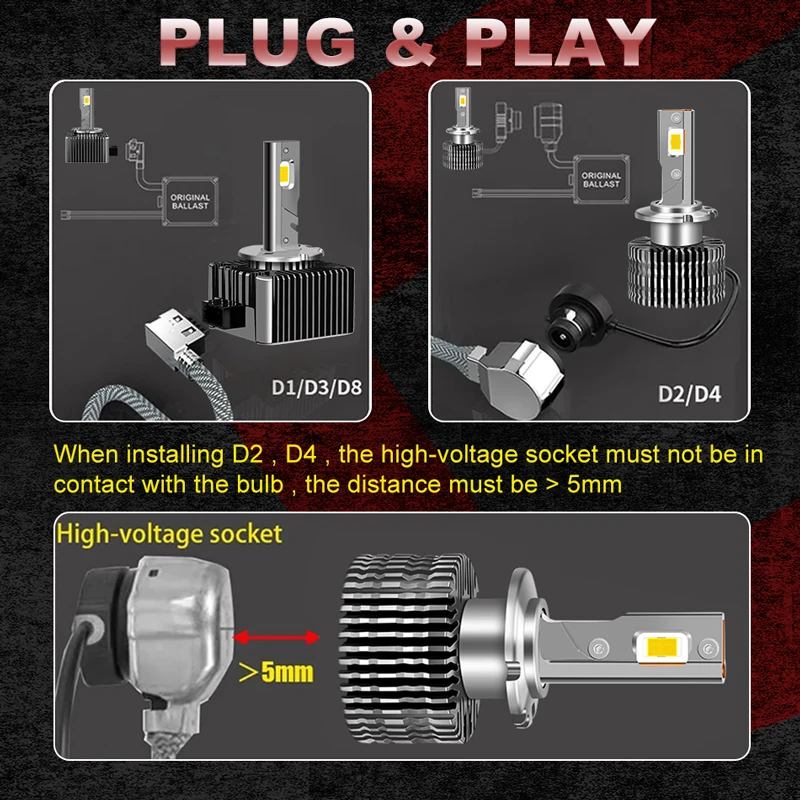 | Haute luminosité, + 500% plus lumineux que la voiture d’origine HID | Les modèles disponibles sont limités: D1S/D1R/D2S/D2R/D3S/D3R/D4S/D4R/D5S/D8S |