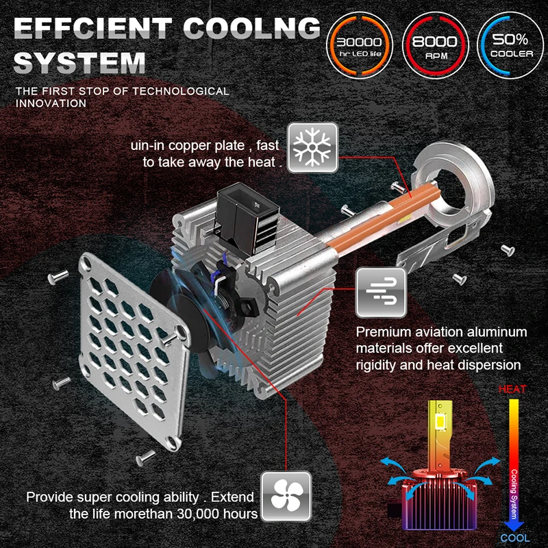 - Longue durée de vie, jusqu’à 50000 heures de vie, 10 fois celle du HID