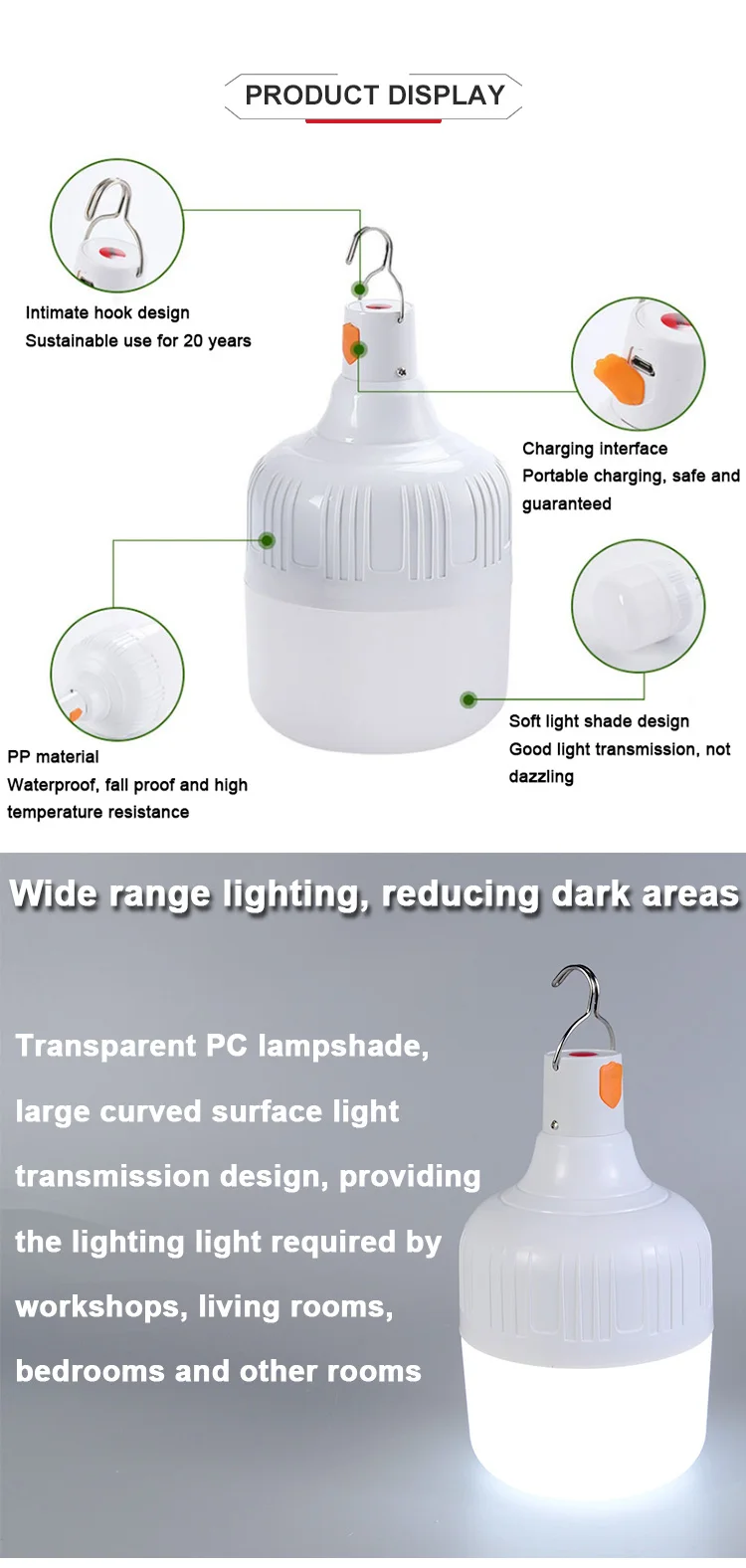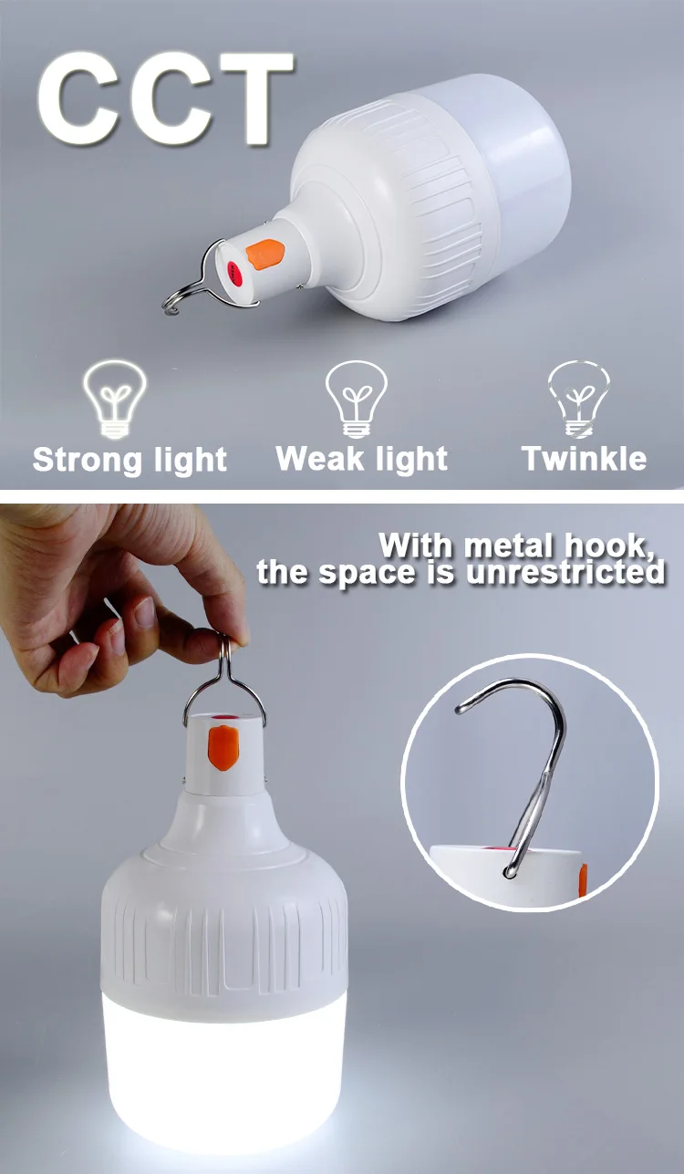 Ampoule LED portable et rechargeable, parfaite pour une utilisation en extérieur. Fabriquée en aluminium et en PP, elle est résistante à l’eau et aux chocs. Disponible en trois puissances différentes, elle offre une luminosité ajustable sur trois niveaux. La batterie au lithium 18650 garantit une utilisation durable et la recharge est possible via un port USB. Polyvalente, cette lampe convient aux activités en plein air, aux marchés nocturnes, au camping, etc. Économique en énergie, elle offre également une longue durée de vie grâce à ses perles de lampe LED de haute qualité.