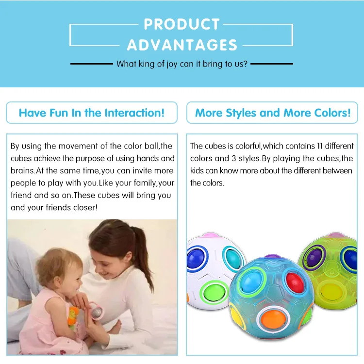 - Avantages: Le cube magique de football arc-en-ciel est un jouet amusant et éducatif. Il est fabriqué à partir d’un matériau sûr et léger, ce qui le rend facile à manipuler pour les enfants et les adultes. Il est également portable, ce qui permet de l’emmener partout.