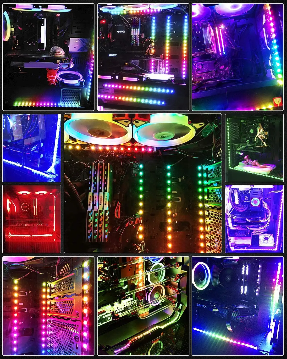 Ces bandes LED sont conçues pour être utilisées avec une connectique 3 broches + 5V ADD_Header. Veuillez ne pas les connecter à une connectique 4 broches RGB_HEADER 12V (12V, G, R, B), cela endommagerait l’ensemble de la bande LED. Ces bandes LED sont idéales pour les joueurs de jeux vidéo qui souhaitent personnaliser leur boîtier PC.