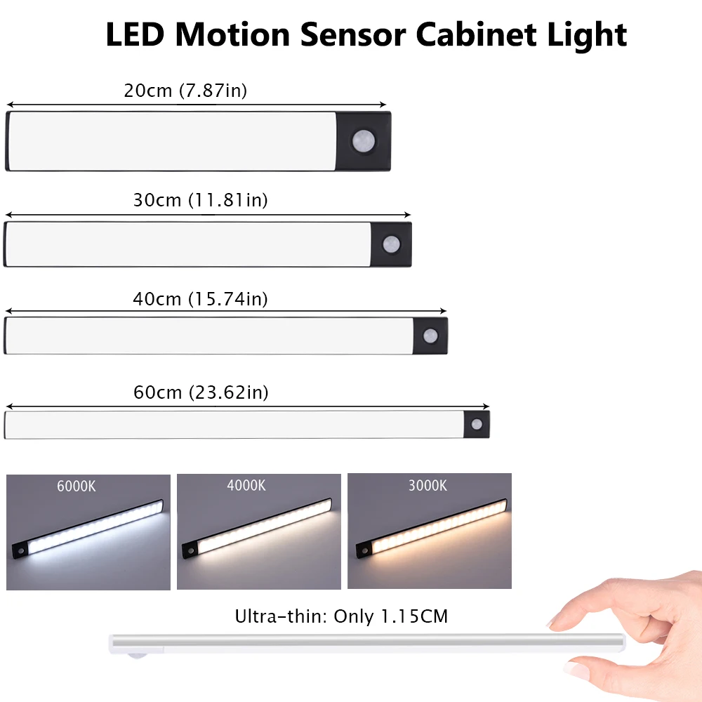 La lumière d’armoire magnétique LED avec capteur de mouvement est un produit polyvalent idéal pour une utilisation dans une cuisine, une garde-robe ou une chambre à coucher. Disponible en différentes longueurs (20cm, 30cm, 40cm, 60cm), cette lumière offre une apparence mince et simple avec une épaisseur de 1.15cm. Elle est dotée d’une détection intelligente du corps humain, s’allumant lorsque la lumière est faible et que les gens s’approchent. Vous pouvez choisir parmi trois couleurs de lumière (blanche, chaude et neutre) avec un réglage en continu. La batterie au lithium intégrée a une grande capacité et offre une luminosité suffisante et une longue durée de vie. L’installation magnétique permet un assemblage et un démontage faciles.