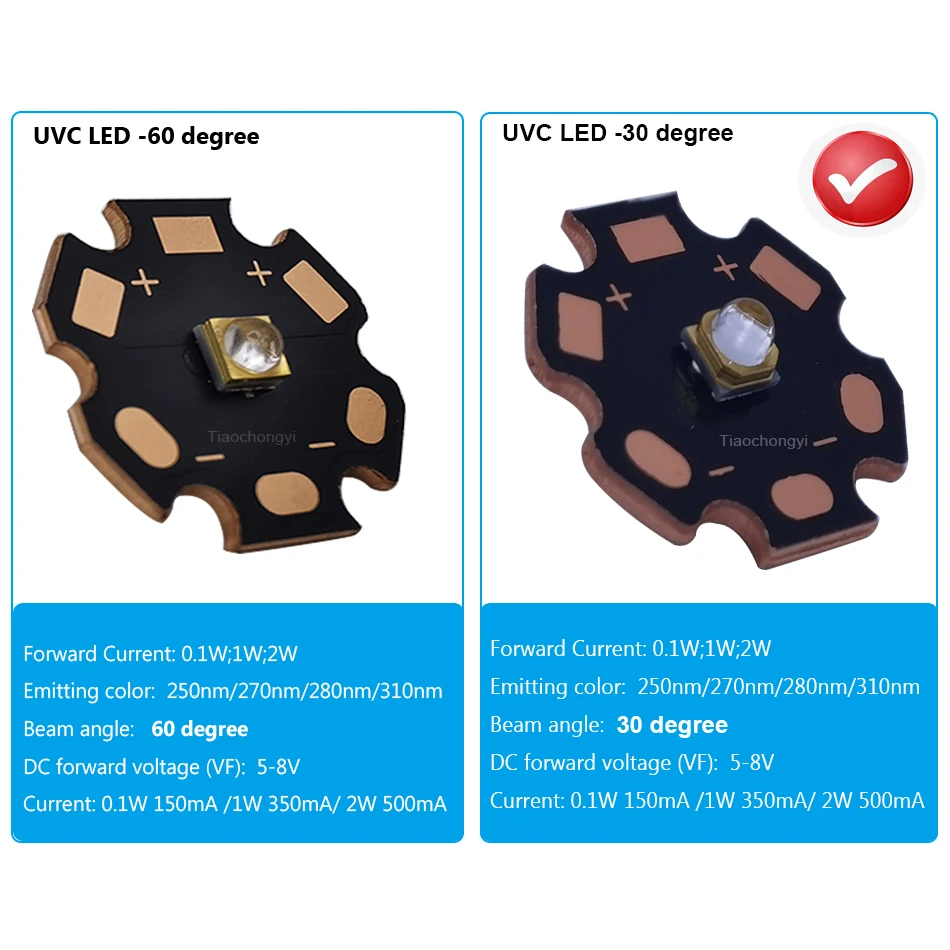 La diode électroluminescente avec PCB en cuivre, lampe en verre ultra, LED UV UVC est conçue pour émettre une lumière ultraviolette de différentes longueurs d’onde. Elle a un angle de faisceau de 30 degrés, ce qui permet une excellente concentration de la lumière. Disponible en différentes puissances (0.1W, 1W, 2W) et longueurs d’onde (250nm, 270nm, 310nm), cette diode électroluminescente est polyvalente et peut être utilisée dans de nombreux domaines tels que la santé, la désinfection, et bien d’autres.
