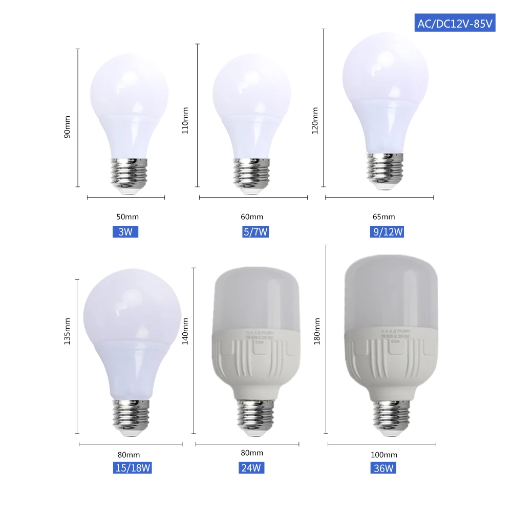 | Ampoule LED E27 DC 12V-85V | 3W 5W 7W 9W 12W 15W 18W 24W 36W | Prise en charge AC/DC 12V 24V 36V 48V 60V | E27 | SMD2835 | 1 an | Ra80 | Blanc froid 6000-6500K, Blanc chaud 2700-3200K | 5 pièces/lot |