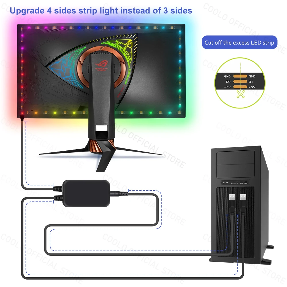 Cependant, il convient de noter que ce produit est plus adapté aux écrans à 4 côtés. Pour les écrans à 3 côtés, la bande LED ne couvre pas le côté inférieur. Si vous avez commandé ce produit avant le 13 novembre 2023, vous bénéficierez de la version pour écran à 3 côtés. Pour les commandes à partir du 14 novembre 2023, la version pour écran à 4 côtés sera disponible.