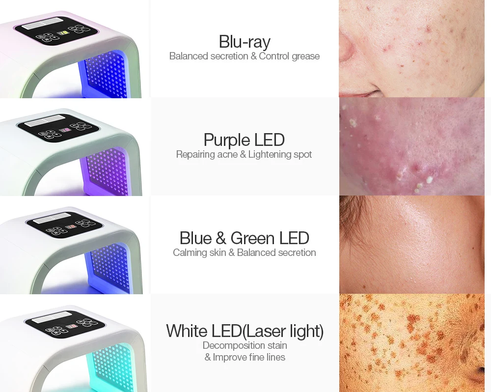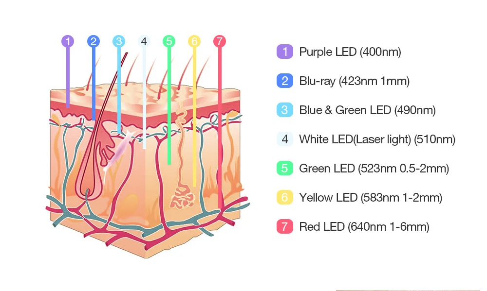- L’irradiation de longueurs d’onde spécifiques de 420 nm à 640 nm pour résoudre des problèmes de peau