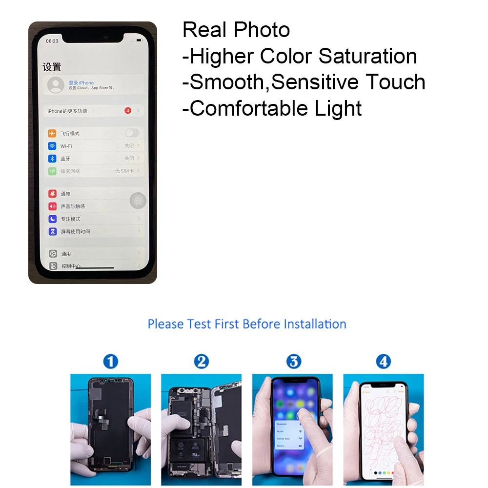 | Description | Pièces: Verre extérieur + écran LCD + panneau tactile + anneau de caméra avant + anneau de capteur de lumière + maille anti-poussière Earspesker, pré-assemblé. |