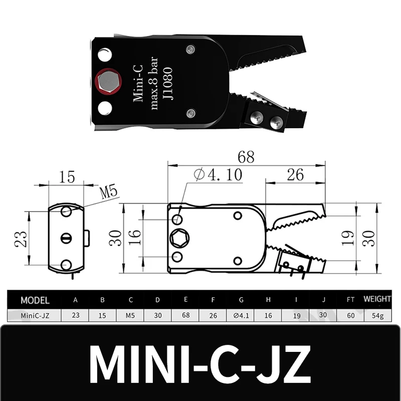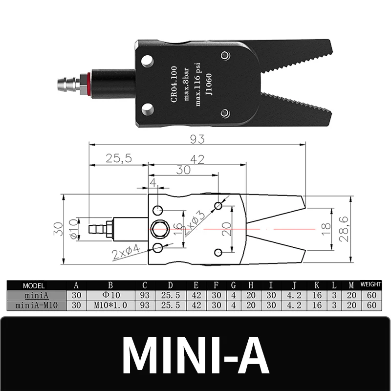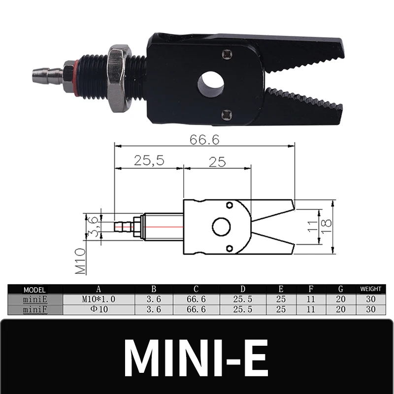 La Mini pince de serrage pour Machine de moulage par Injection, Mini Robot, pneumatique, robotique, avec capteur, cylindre d’air, MINIA/C/B/E/F est un produit polyvalent et efficace dans le domaine du moulage par injection. La pince est conçue pour faciliter le processus de moulage en assurant un serrage précis et sécurisé des pièces.
