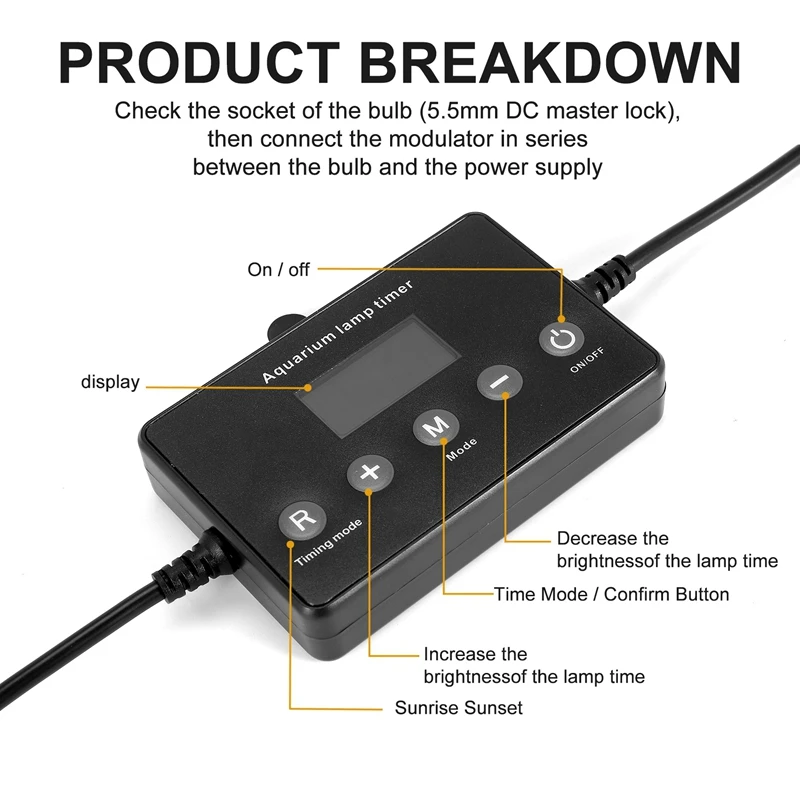 La minuterie de lumière d’aquarium LED intelligente est compatible avec la plupart des lumières d’aquarium avec des entrées et des sorties de 12-24 V. Elle dispose également d’une mémoire interne qui stocke les paramètres prédéfinis en cas de panne de courant.