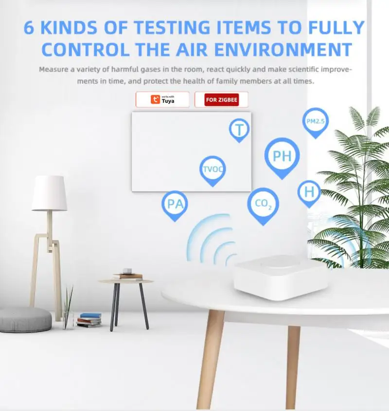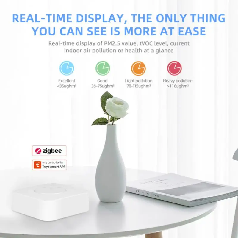 - Détecte PM2.5, formaldéhyde, COV, CO2, température et humidité