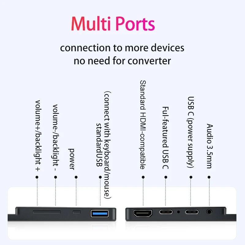 Il est doté de multiples interfaces, dont une entrée HDMI standard compatible, un port USB-A et une prise jack 3,5 mm. De plus, il dispose de deux ports USB-C pour une connectivité pratique avec différents types d’appareils.