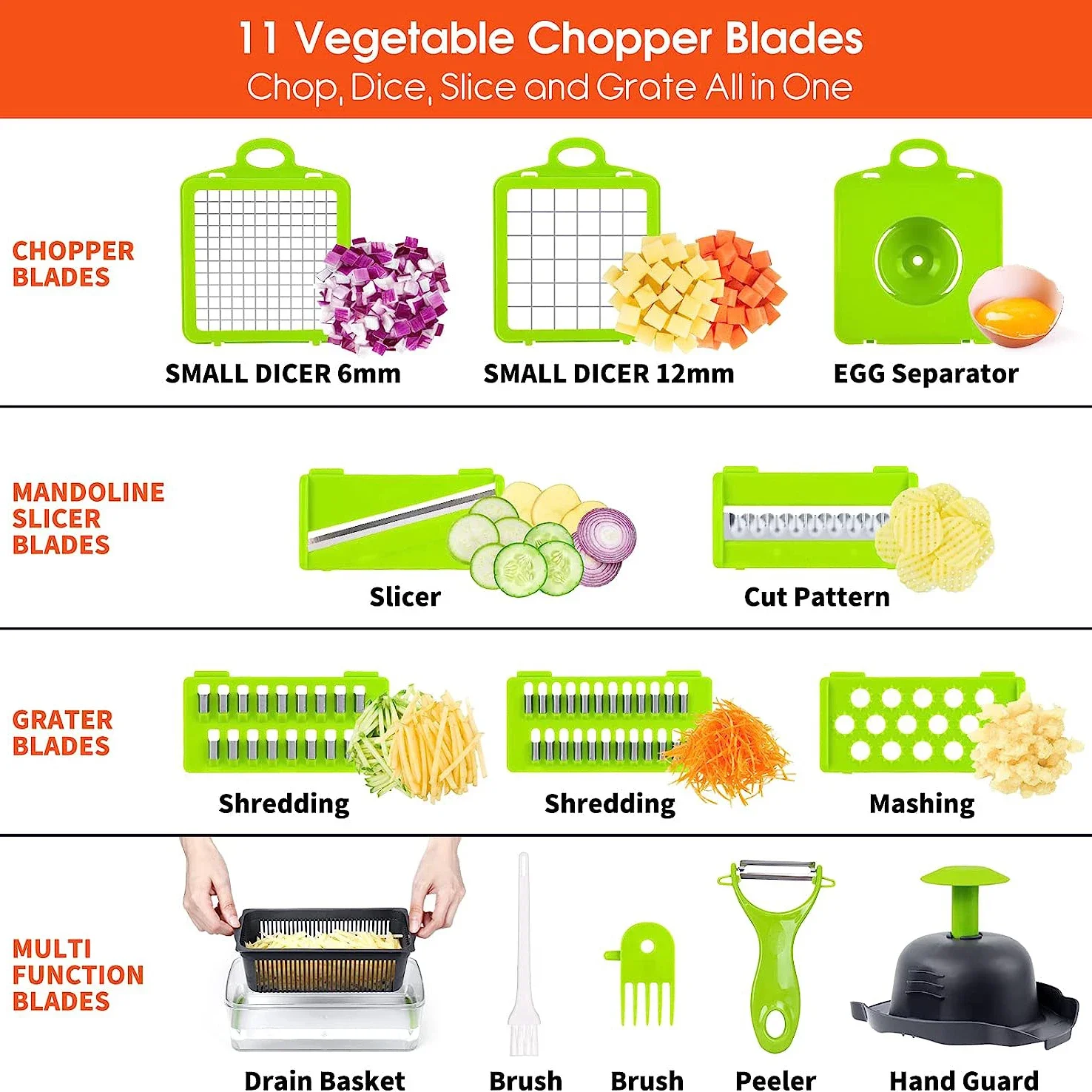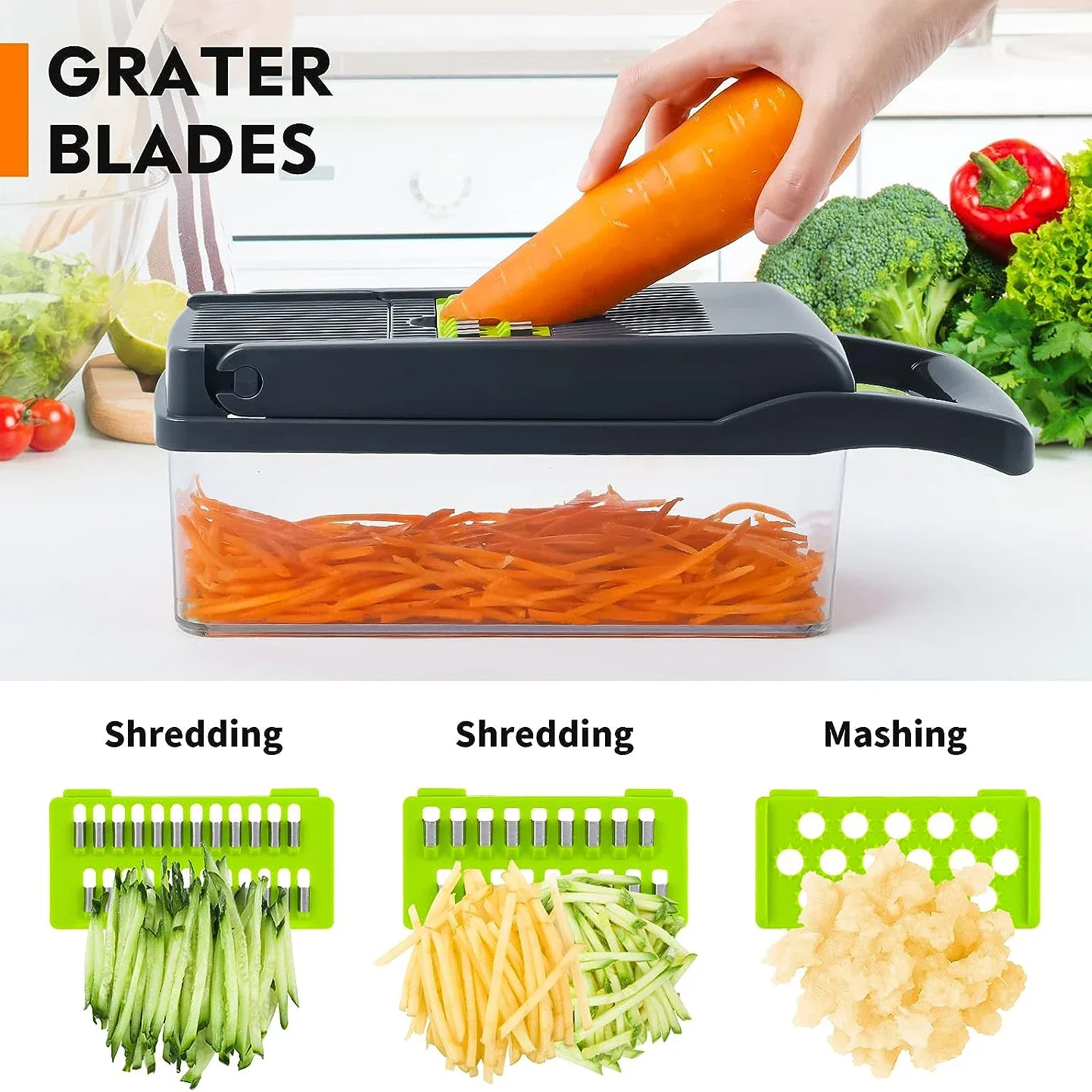 Test et Avis sur le Coupe-légumes professionnel avec panier de filtre, hachoir à oignons, déchiqueteuses de carottes et de pommes de terre, râpe, gadget de cuisine, 12 en 1, Gar1995