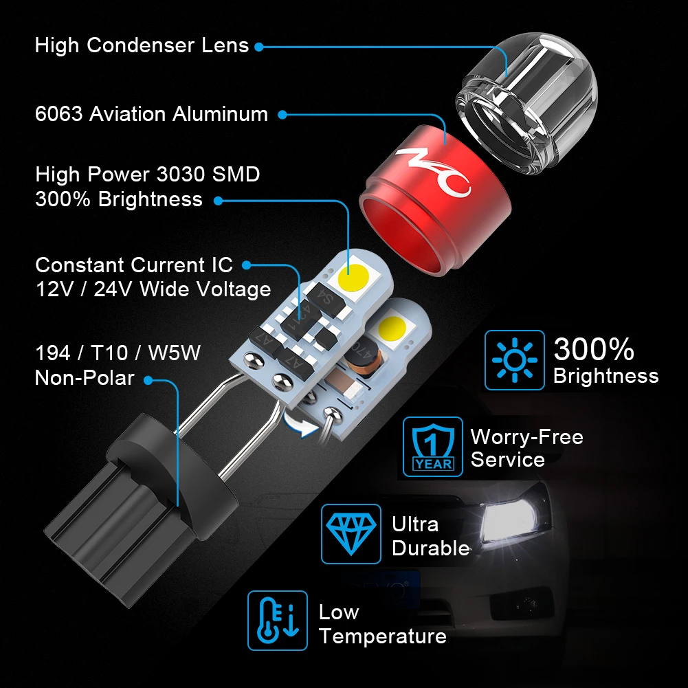 | Modèle | T10 LED W5W ampoule LED 3030 SMD 168 194 5W5 |