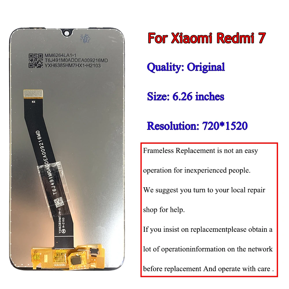 Cet écran tactile d’affichage à cristaux liquides est une pièce de réparation d’assemblage d’origine pour le Xiaomi Redmi 7. Il est disponible en couleur noir et sa taille principale est de 6.26 pouces. Fabriqué avec un matériau de haute qualité, cet écran offre une résolution de 720*1520 pour une expérience visuelle optimale. Il est entièrement compatible avec le modèle Redmi7 M1810F6LG et M1810F6LH. Avec cet écran tactile, vous pouvez donner une nouvelle vie à votre Xiaomi Redmi 7 en remplaçant facilement l’écran endommagé.
