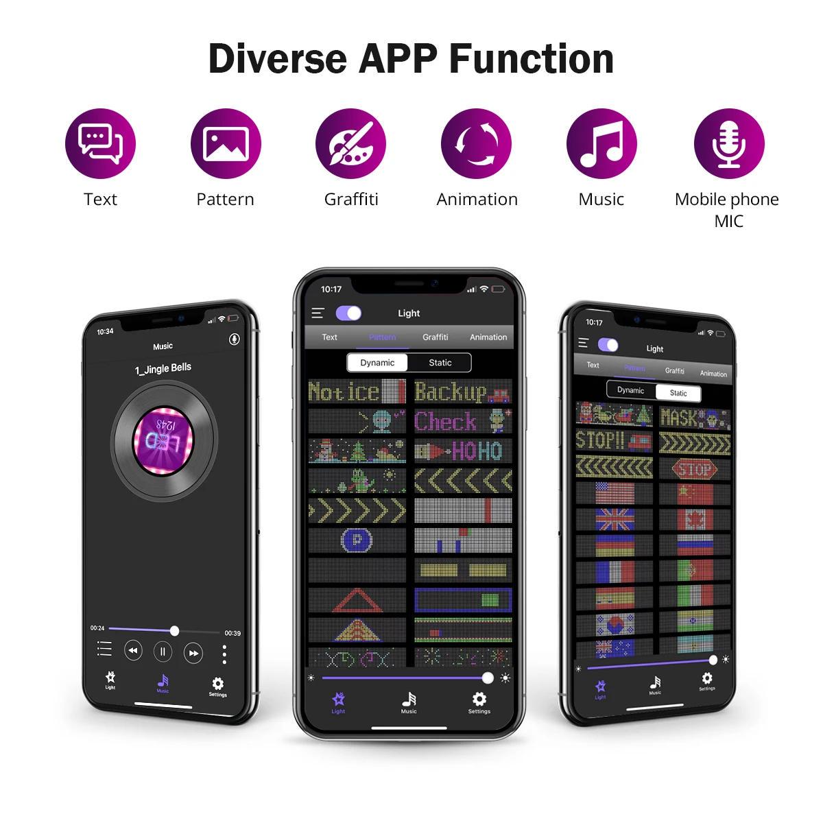 Connectez la matrice LED via l’application, vous pouvez concevoir du texte, des motifs, des animations en fonction de vos propres besoins et scènes, et vous pouvez également ajuster la luminosité et la vitesse pour répondre parfaitement à vos besoins.