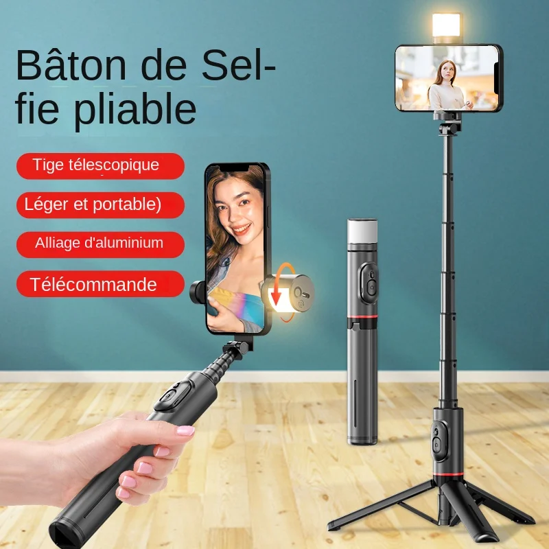 - Perche à selfie télescopique portable avec lumière d’appoint