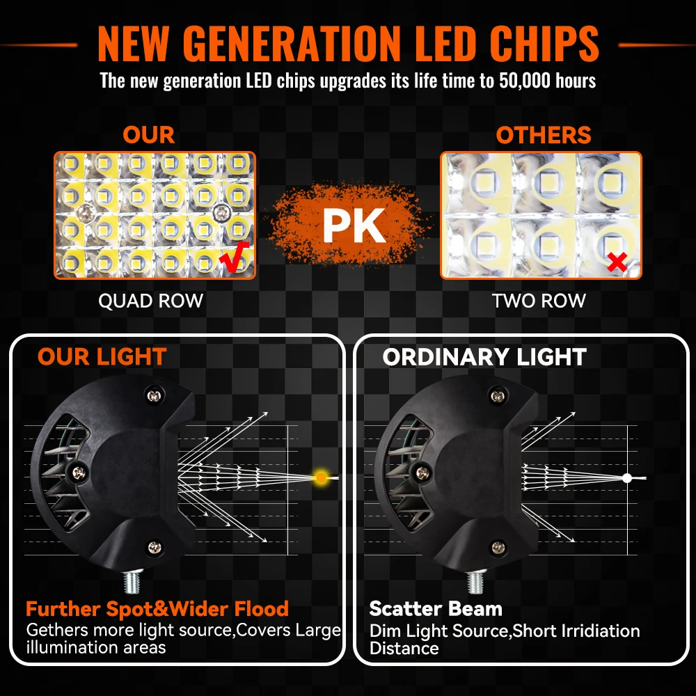 - Faisceau lumineux : faisceau combiné, faisceau ponctuel, feux de brouillard à faisceau d’inondation