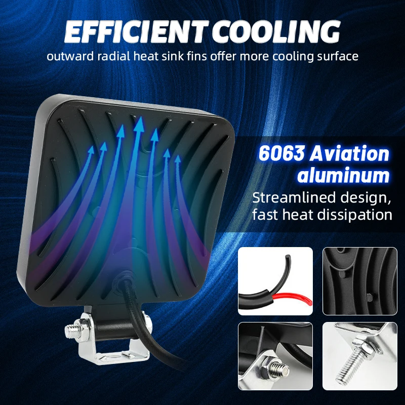 Le phare de travail est conçu avec un matériau en aluminium 6063 moulé sous pression noir, ce qui lui confère une grande résistance aux chocs et aux vibrations. Sa certification CE et ROHS atteste de sa conformité aux normes de sécurité.