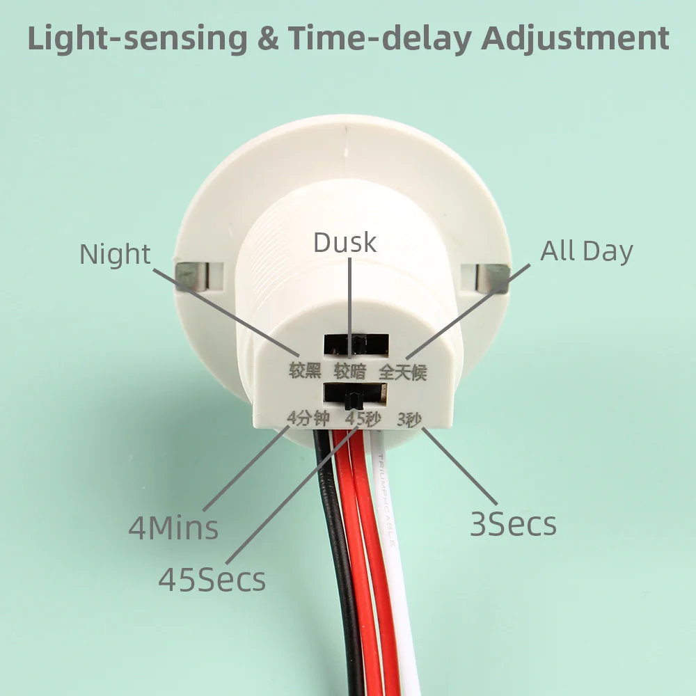 Le détecteur de mouvement PIR peut détecter les mouvements jusqu’à une distance de 5m et dispose de trois options de détection de lumière : nuit, crépuscule ou toute la journée. Il offre également trois options de temporisation : 3 secondes, 45 secondes ou 4 minutes.
