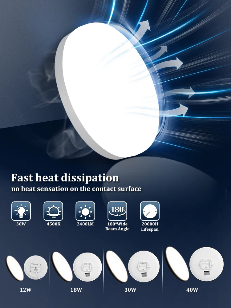 Le plafonnier LED ultramince est disponible en différentes puissances, notamment 12W, 18W, 30W et 40W. Vous pouvez choisir celui qui convient le mieux à vos besoins d’éclairage.