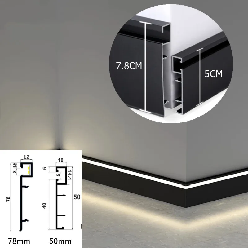 0.5/1M/Pcs 50mm 78mm LED Aluminium Profile Baseboard Hard Bar Strip Light Suface Mounted Metal Wall Skirting Channel Linear Lamp