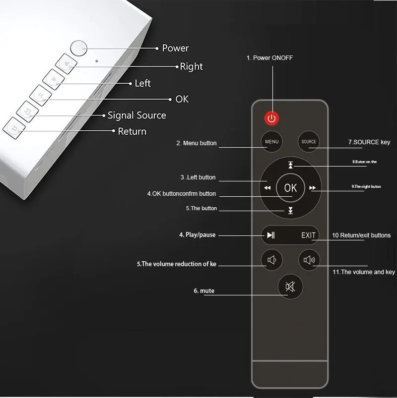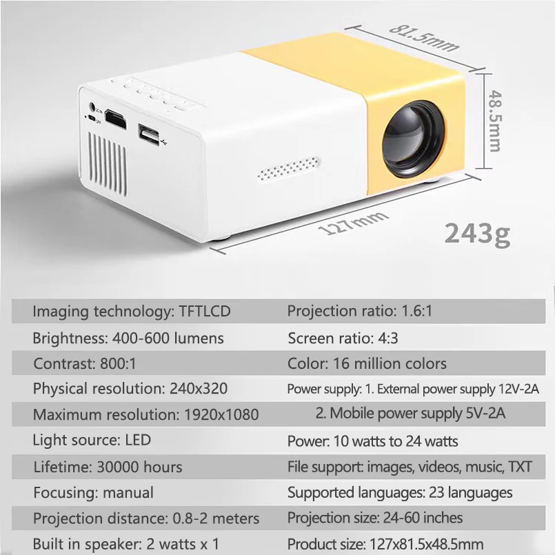 Le YG300 est doté d’un design innovant. Ses dimensions compactes de 12.50×8.50×4.50 cm et son poids léger de 245 grammes en font un projecteur pratique et portable. Il est fabriqué en plastique ABS de protection de l’environnement, sans odeur particulière, pour assurer la sécurité et la santé de votre famille.