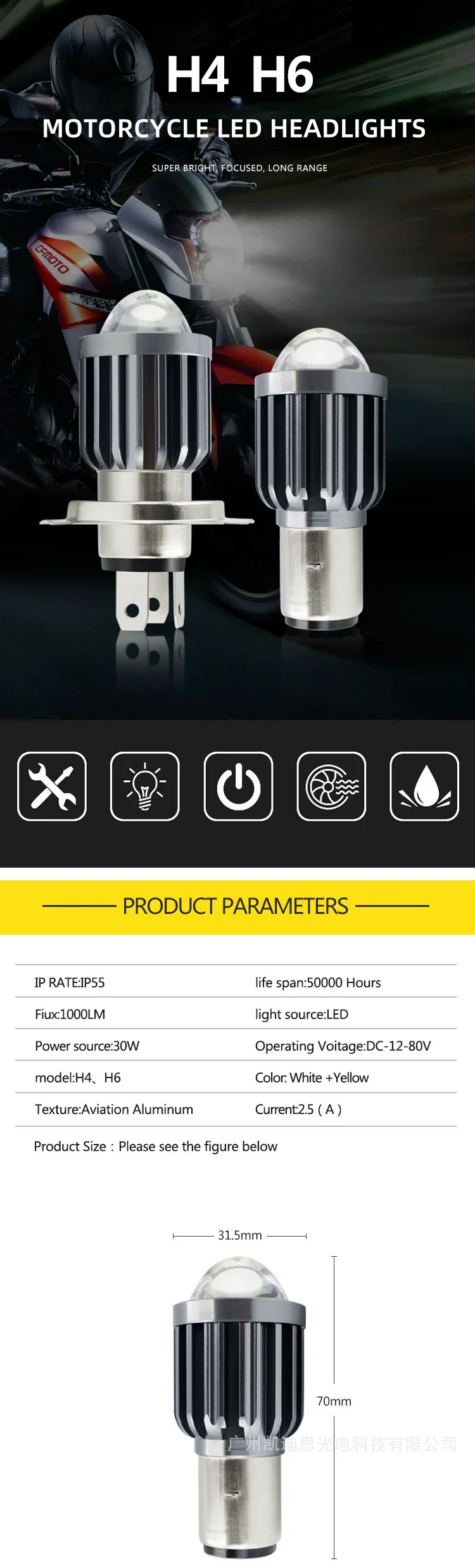Le projecteur LED à faisceau haut et bas pour moto est un produit de qualité supérieure offrant de nombreux avantages pour les motocyclistes. Avec une durée de vie de 50000 heures et une luminosité de 1000LM, ce projecteur garantit une excellente visibilité sur la route, de jour comme de nuit. Grâce à sa source lumineuse LED, il offre un éclairage super lumineux pour assurer votre sécurité sur la route. Son design COB et CSP assure une dissipation thermique stable, tandis que sa texture en aluminium d’aviation garantit sa durabilité.