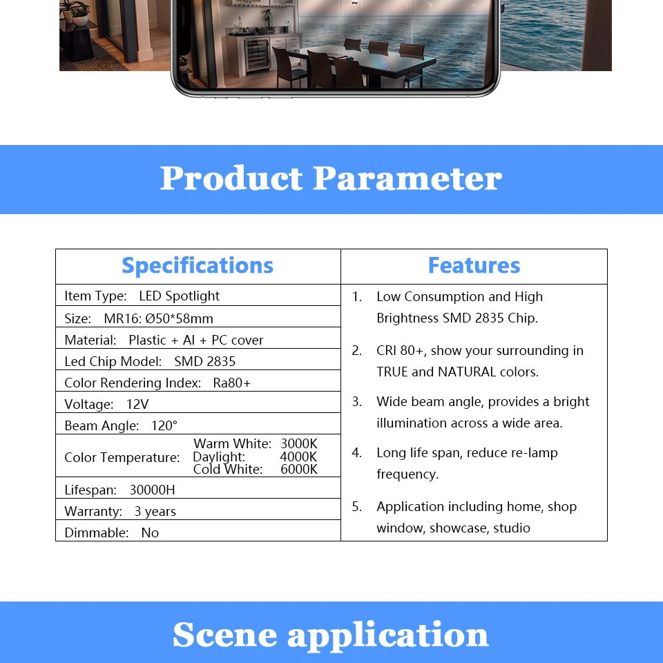| Taille | MR16: Ø50*55mm |