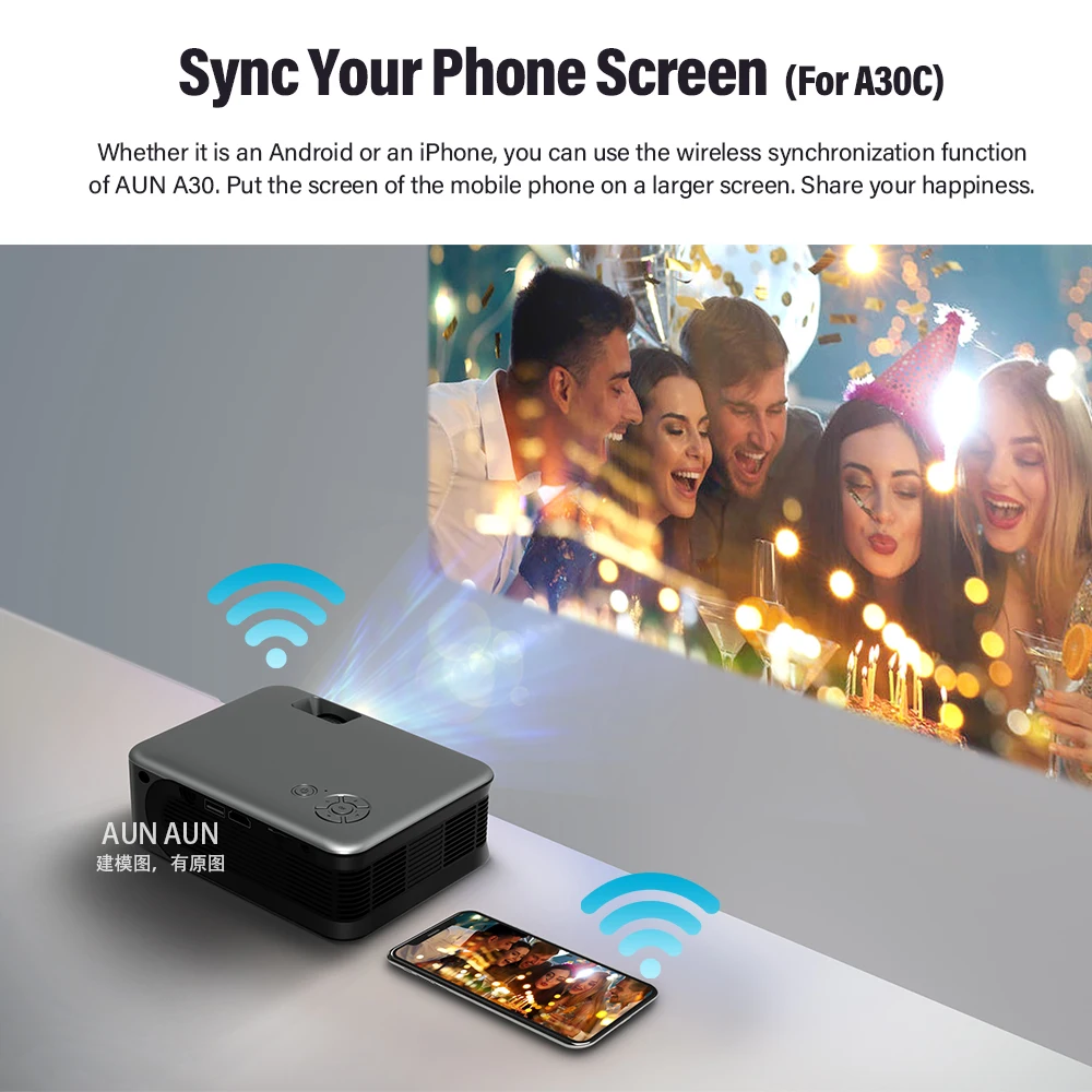 AUN Mini budgétaire LED portable A30C Pro, home cinéma 3D, Wi-Fi, compatible avec smartphone Android iOS, Full HD 1080P, vidéo 4K
