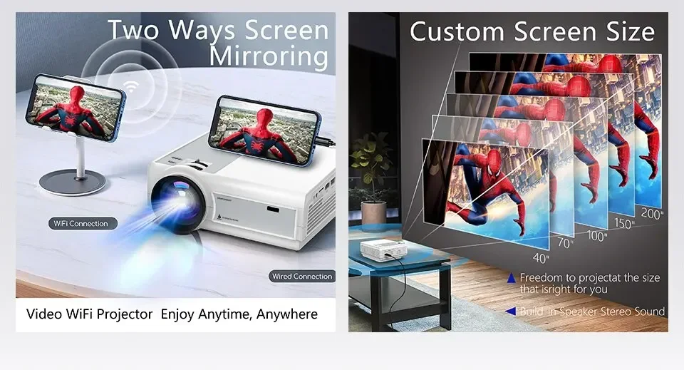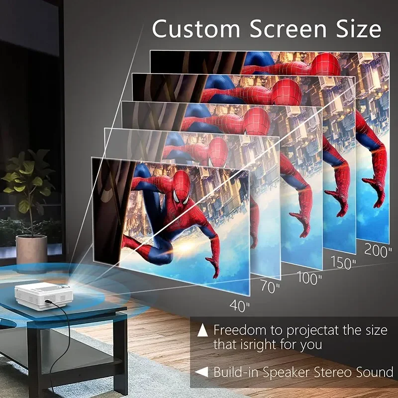 Projektorgröße ist 40-200 Zoll, die einfach, die Größe zu ändern, was Sie brauchen.