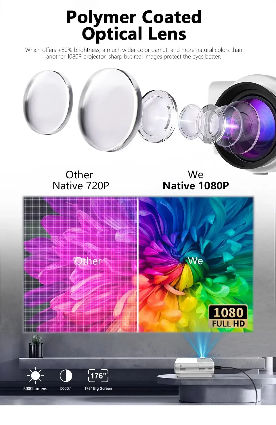 | Full HD 1080p Auflösung | Genießen Sie kristallklare Bilder mit der hohen Auflösung des Projektors, der sowohl Full HD 1080p als auch 4k-Dekodierung unterstützt. |