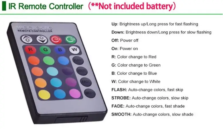 - Couleur de la lumière: blanc/blanc chaud/rvb (Le blanc et le blanc chaud ne sont pas inclus, télécommande à 24 touches)