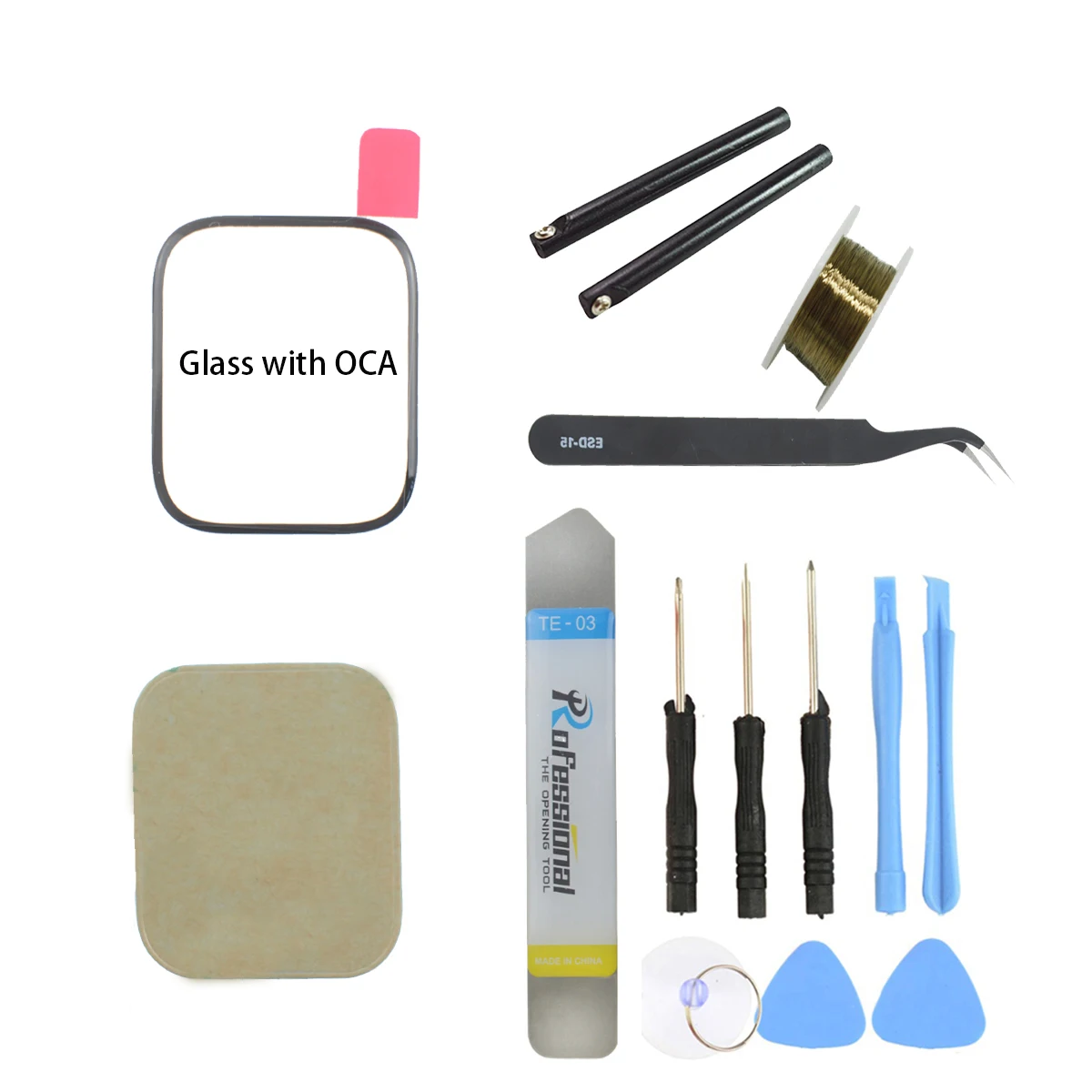 | Inclus | Verre avant avec colle OCA, ruban adhésif, film d’écran, pince à épiler, ligne de coupe avec poignées, ensemble d’outils, lame en acier inoxydable |