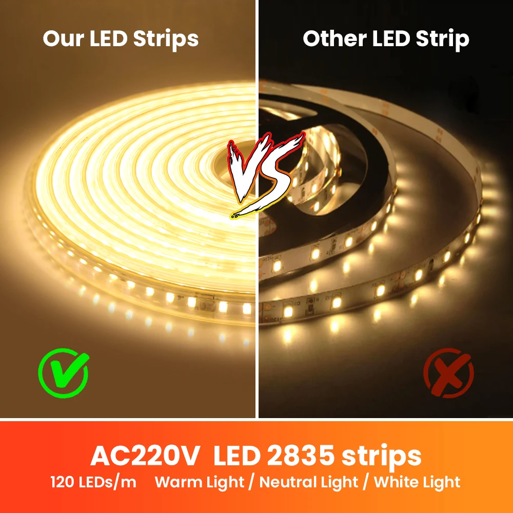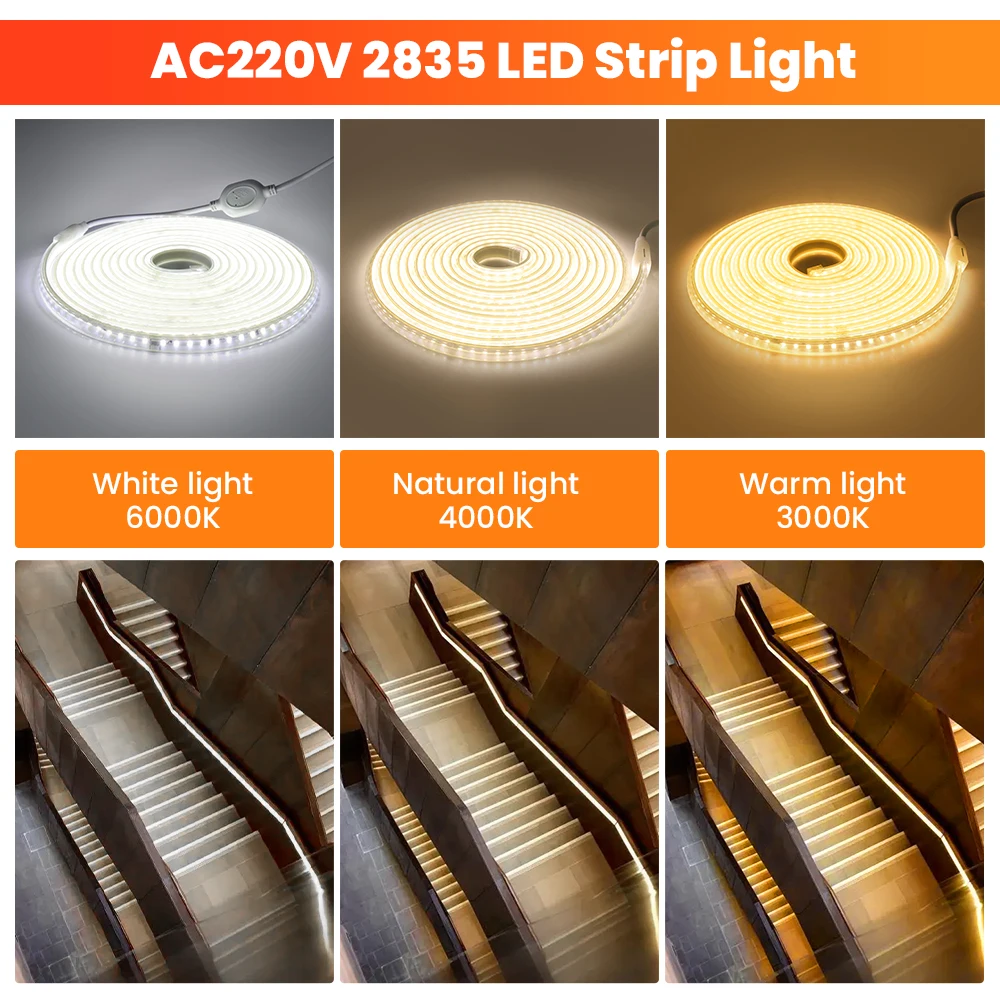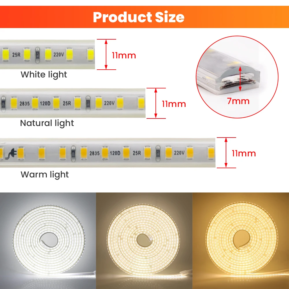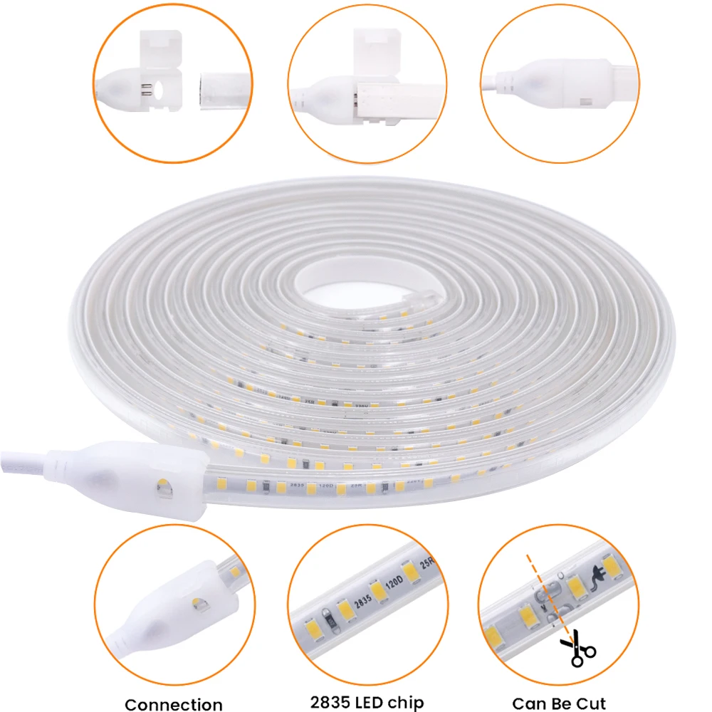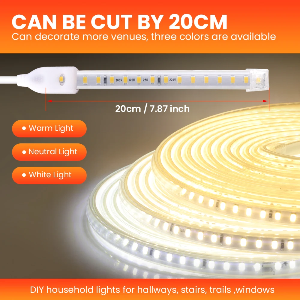 Bande lumineuse LED flexible de 20 cm, 220V 2835SMD, 120 diodes/m, haute qualité, ruban LED étanche pour l’extérieur, décoration de la maison