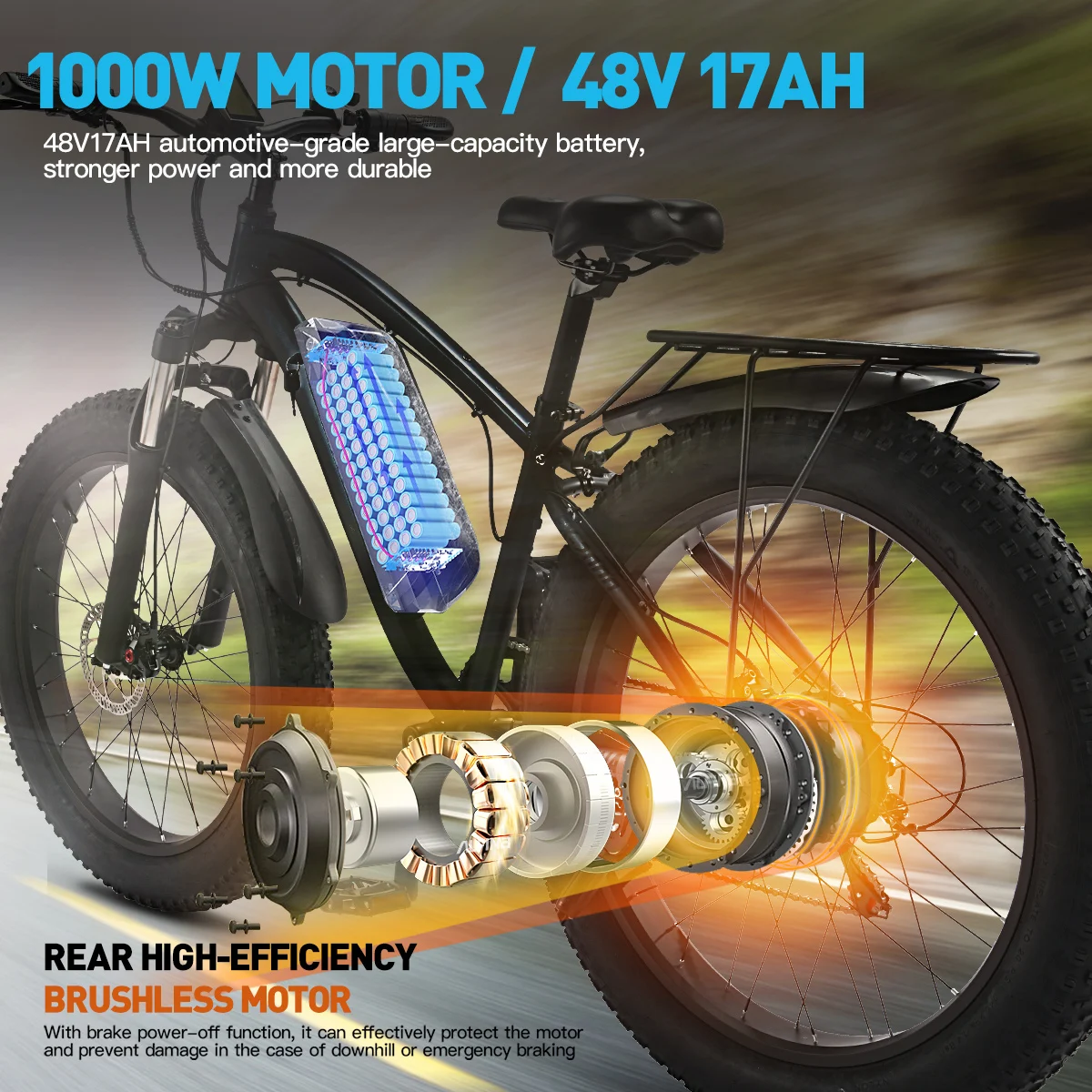 Le moteur arrière sans balais de 1000W garantit performance et qualité. Il convient parfaitement à la randonnée et à l’exploration de la jungle.