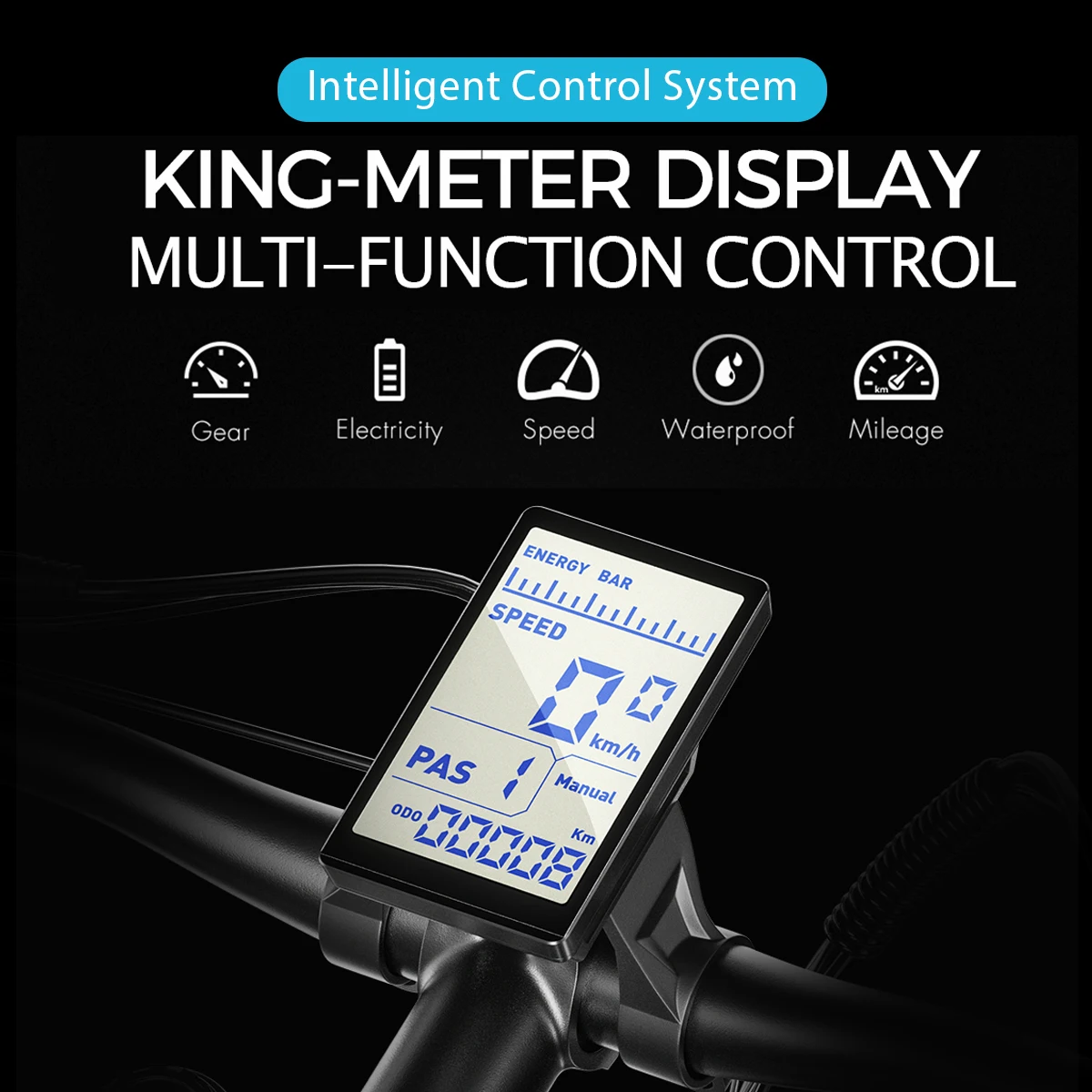 - Écran LCD multifonctionnel étanche affichant le niveau de la batterie, la vitesse, l’équipement et le kilométrage
