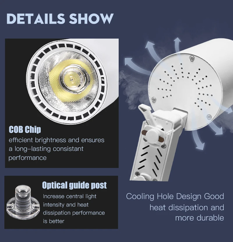 | Nouvelle conception réglable de voie, l’utilisation de la source lumineuse de haute qualité | Ces spots lumineux LED sont dotés d’une nouvelle conception de voie réglable et d’une source lumineuse de haute qualité. |