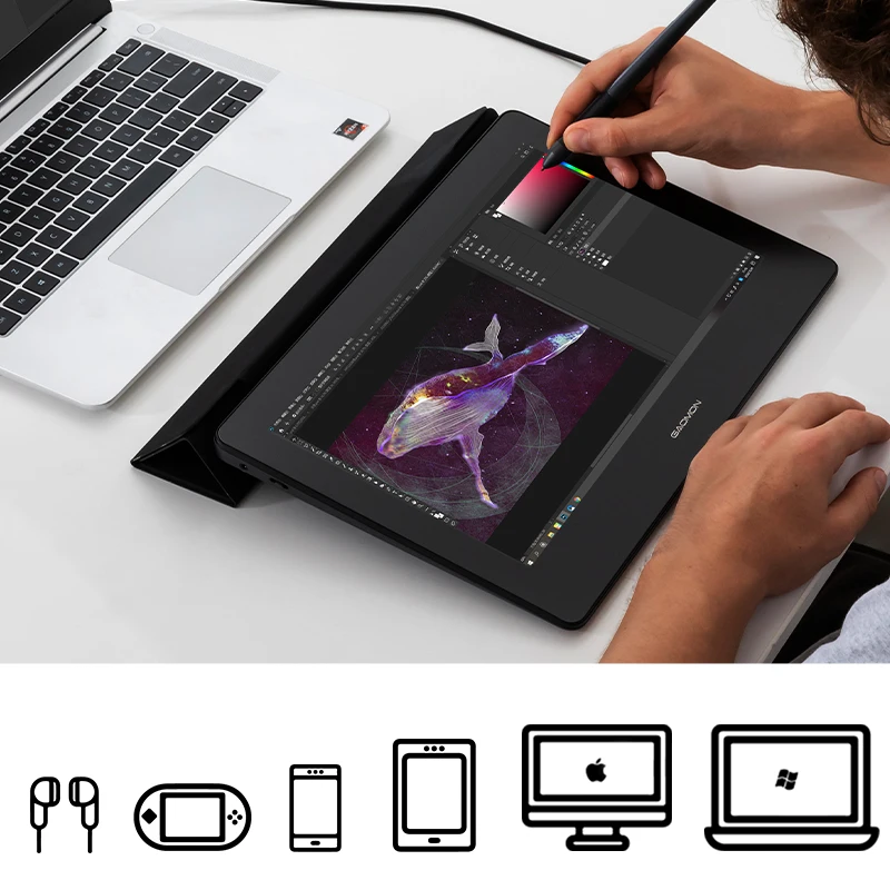 Cette tablette est compatible avec Mac, Windows et Android OS. Elle fonctionne avec les téléphones Android qui répondent aux normes USB3.1 GEN1 et DP1.2 ou supérieures. De plus, elle est compatible avec la plupart des logiciels de peinture tels que Adobe Photoshop, Illustrator, Clip Studio, Lightroom, Sketchbook Pro, Corel Painter, et bien d’autres.