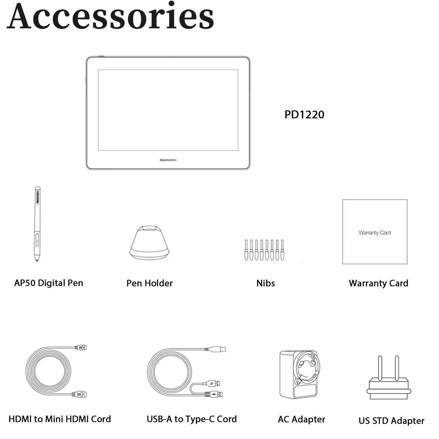 - Accessoires inclus : stylo numérique AP50, porte-stylo, stylo plumes, câbles HDMI et USB-C, carte de garantie, adaptateur 5V/2A