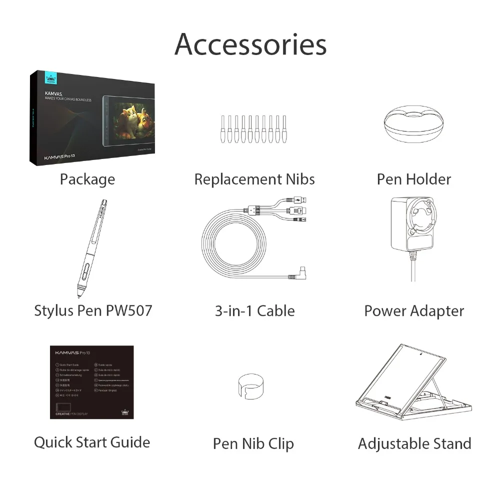 Le KAMVAS Pro 13 est mis à niveau vers le stylo sans pile PW507 et adopte le porte-stylo PH05. En outre, nous avons attaché 10 autres pointes de stylo résistantes à l’usure et 1 levier de levage pour soutenir une charge de travail élevée.