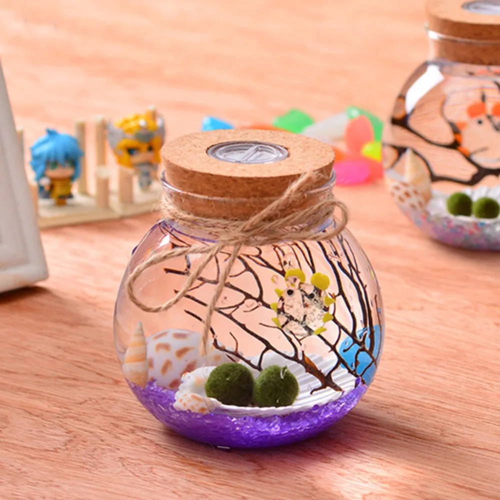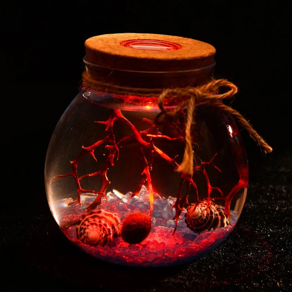 Le terrarium en verre rond avec lumière LED colorée, micro veilleuses de bouteille de pingouin de paysage est un produit idéal pour les amateurs d’aquarium DIY. Il offre la possibilité de créer son propre aquarium marimo en utilisant divers accessoires tels que des ventilateurs de mer, des coquillages, du gravier d’aquarium et des boules de mousse. Le pot en verre est livré vide avec un bouchon en liège contenant une lumière LED colorée. Il suffit d’ouvrir la lampe LED dans le sens antihoraire, de retirer une feuille de PVC blanche isolante et de serrer à nouveau dans le sens horaire pour profiter de la lumière colorée qui change de couleur toutes les 5 secondes. Le résultat est un magnifique monde sous-marin avec une mer bleue éclatante.