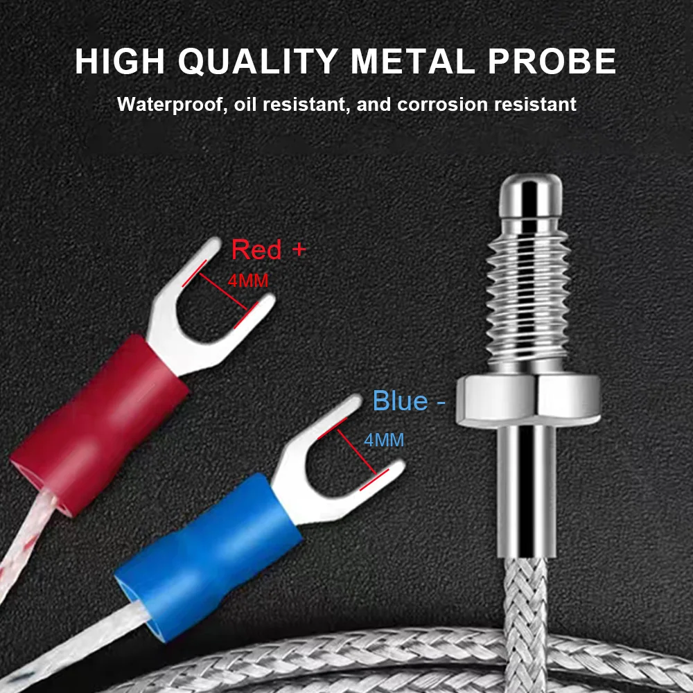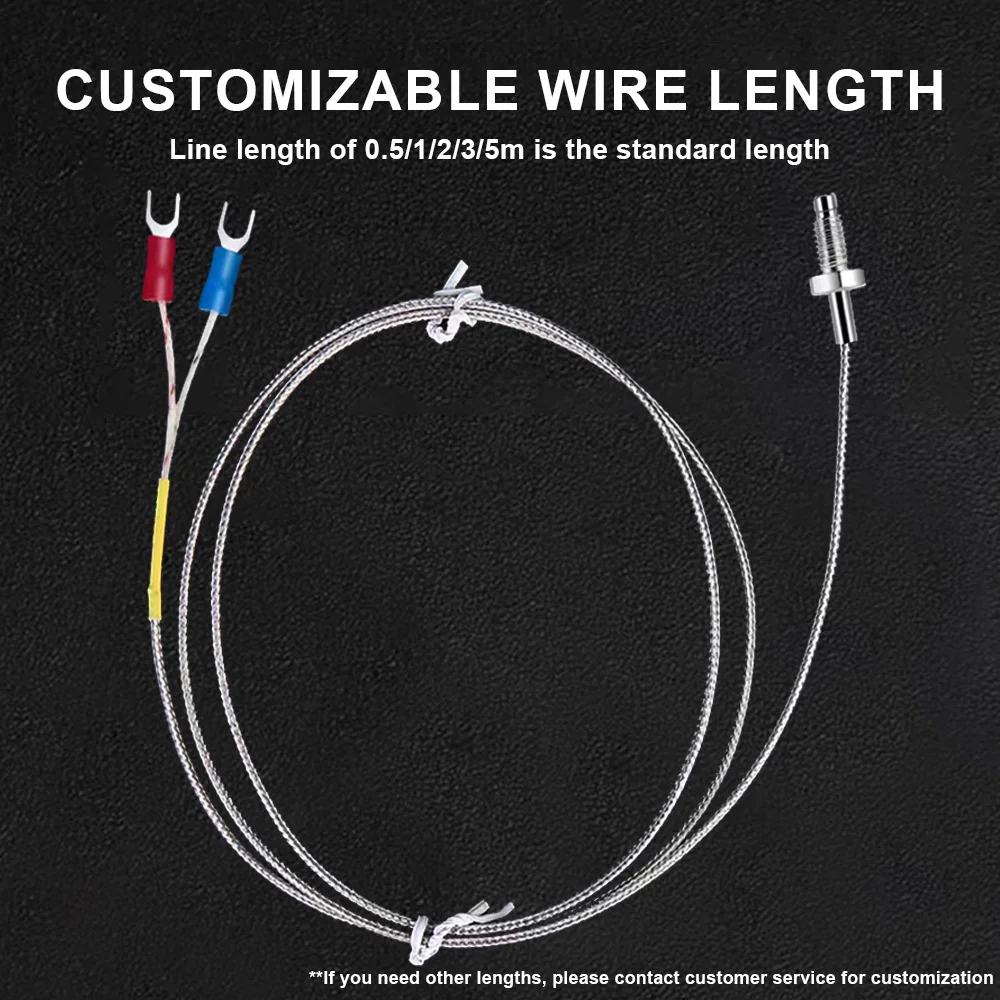Le thermocouple est équipé d’une vis M6 ou M8, ce qui le rend facile à installer dans diverses applications. Avec une longueur de plomb de 0.5 à 5m, il offre une flexibilité d’utilisation.
