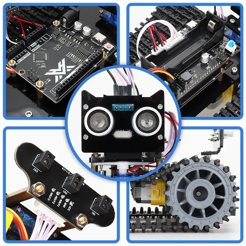 Le kit comprend des modules capables de détecter et de suivre les lignes noires grâce à des lumières infrarouges, ainsi que des modules à ultrasons pour détecter les obstacles et mesurer les distances.