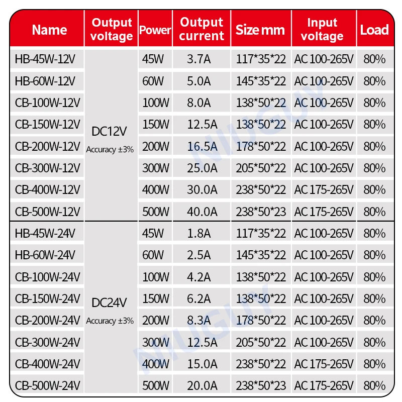 | Tension d’entrée | AC110V-265V (45 ~ 300W), AC175V-265V (400 ~ 500W) |