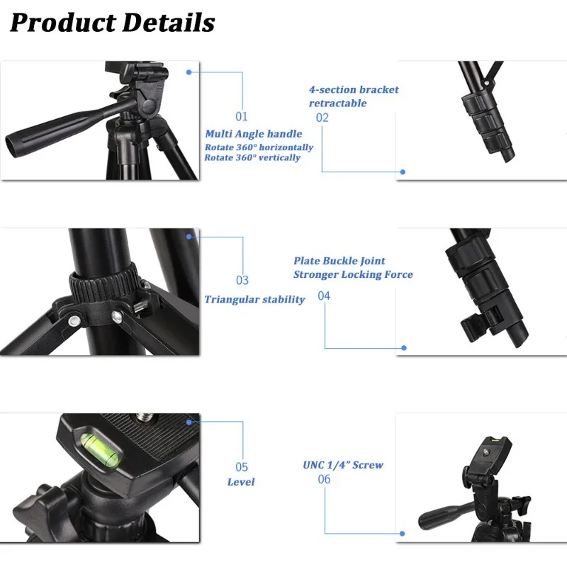 | Matériau en aluminium | Fabriqué en aluminium, ce trépied est robuste et durable, garantissant une longue durée de vie. |