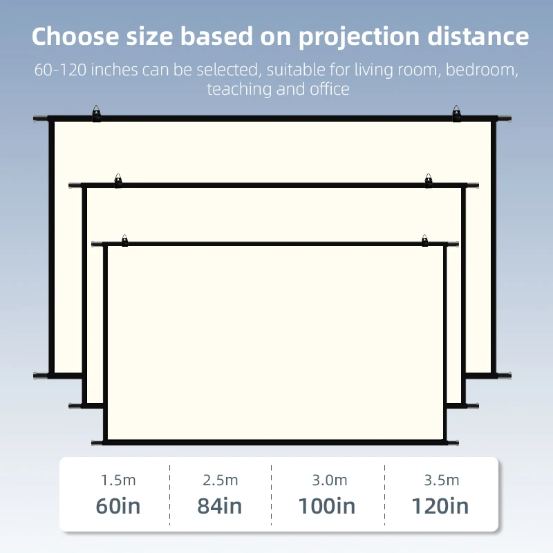 L’écran de projection VEIDADZ mesure 60 pouces de diagonale, avec un ratio de 16:9 pour une image panoramique.