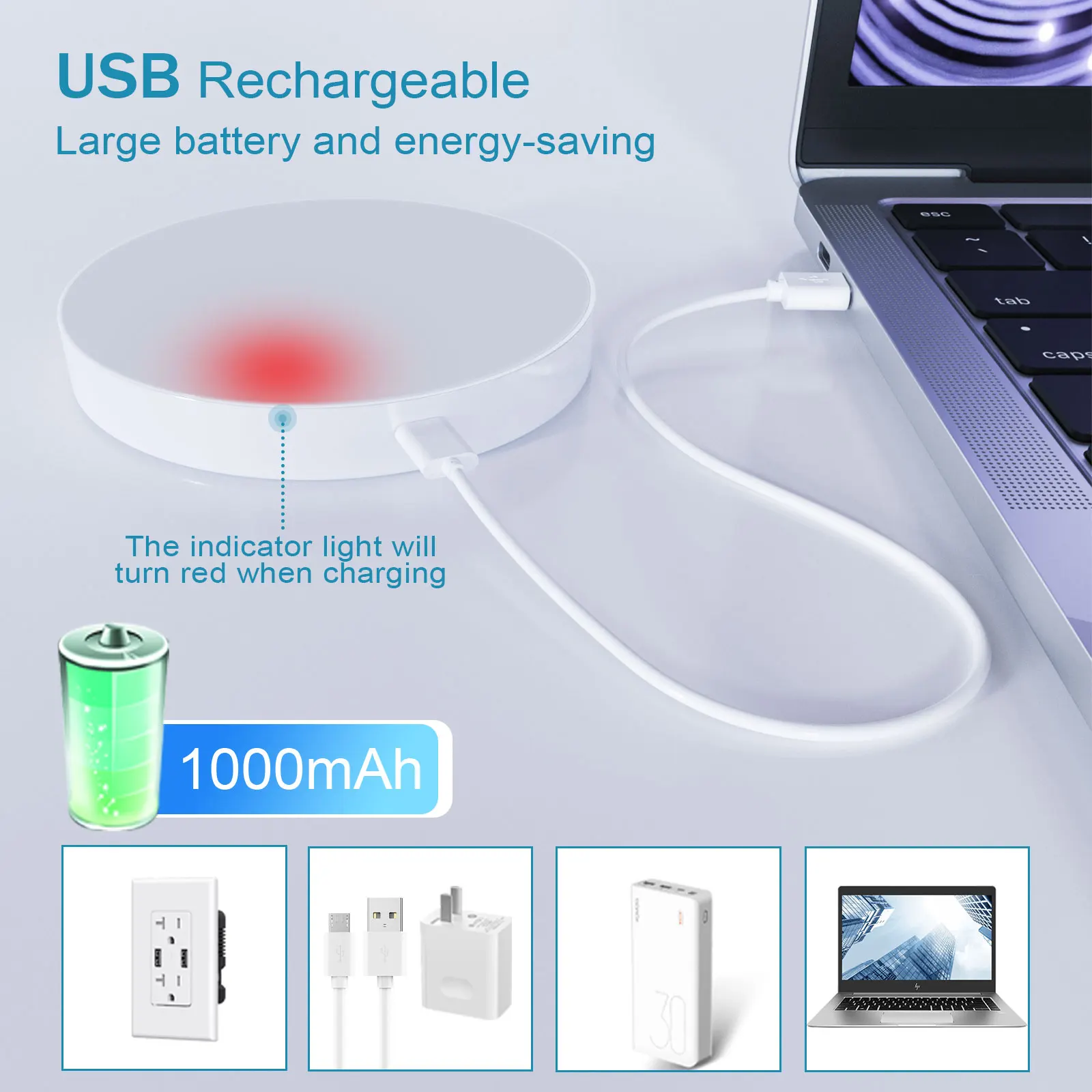 L’indicateur devient rouge lors de la charge, vous pouvez le charger avec un chargeur mural 5V, une alimentation portable ou un ordinateur.
