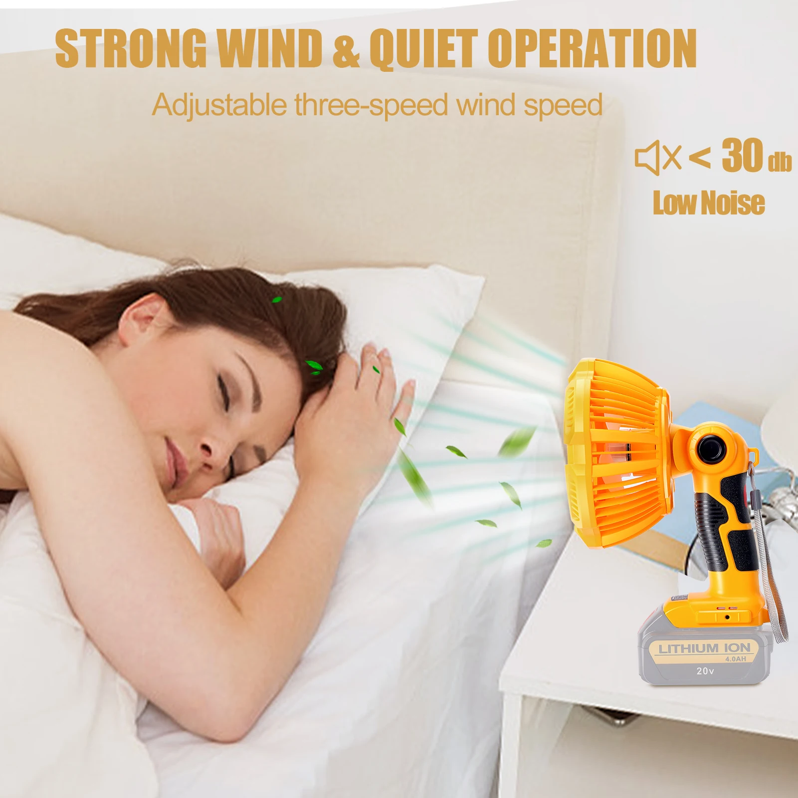Le Ventilateur de camping portable sans fil est un outil multifonctionnel adapté aux batteries Dewalt 14.4-20V. Il utilise un moteur professionnel sans balais pour garantir une vitesse élevée et un flux d’air puissant. Grâce à sa conception, le bruit généré par le ventilateur est inférieur à 30 dB, ce qui le rend idéal pour une utilisation pendant le sommeil ou le travail.