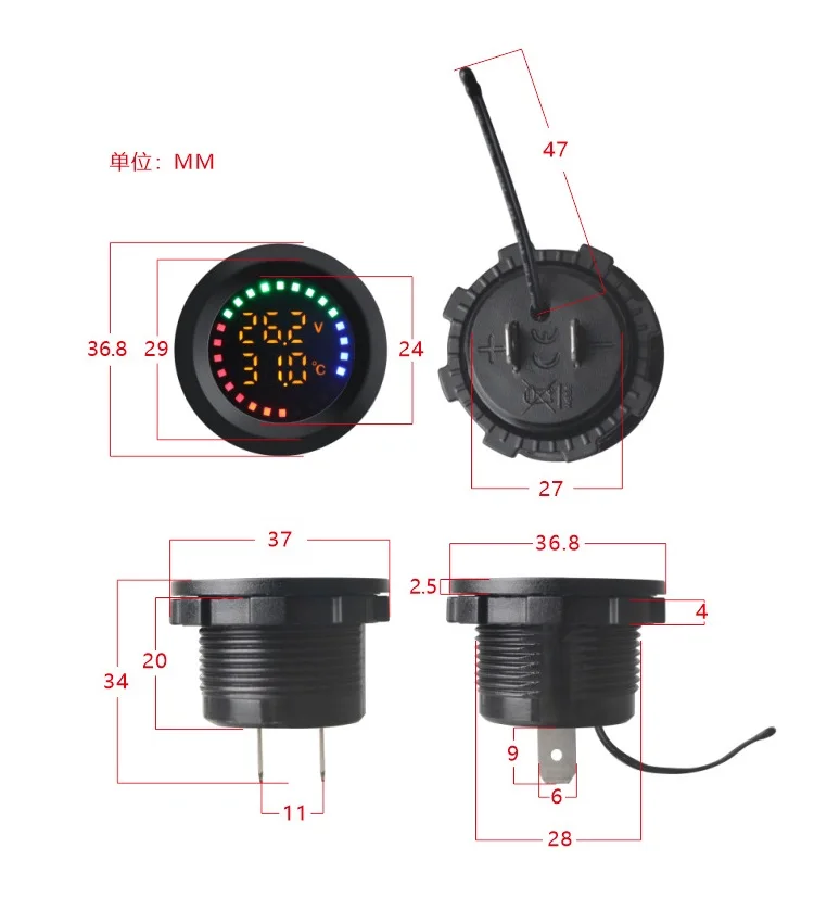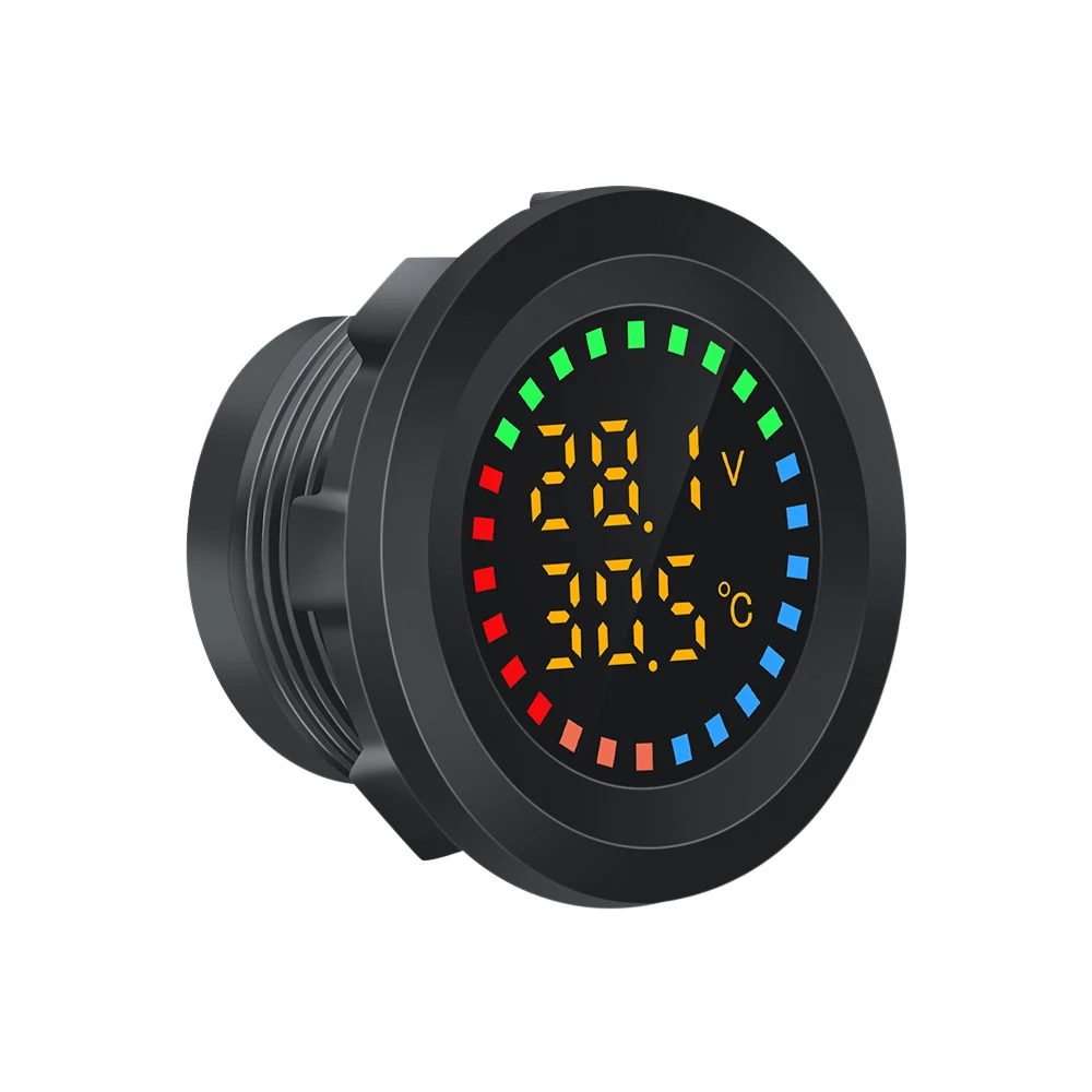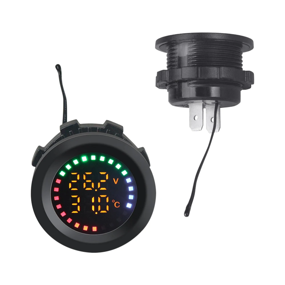 Le Voltmètre universel avec écran coloré, jauge de température, affichage numérique LED, moto, voiture, bateau, yacht, 12V-24V est compatible avec les tensions d’entrée de 12V à 24V.